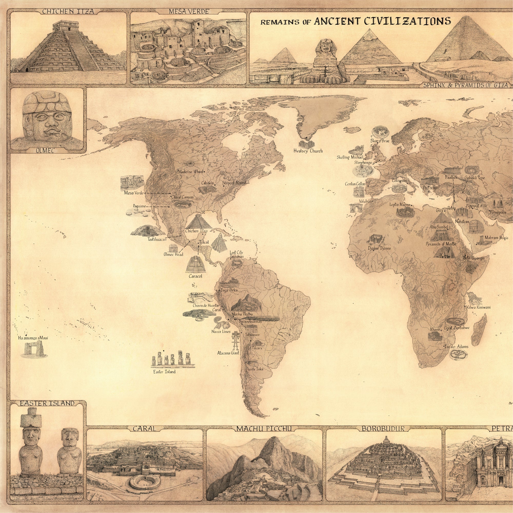 ANCIENT CIVILIZATIONS HAN DRAWN MAP Over 60 ancient sites